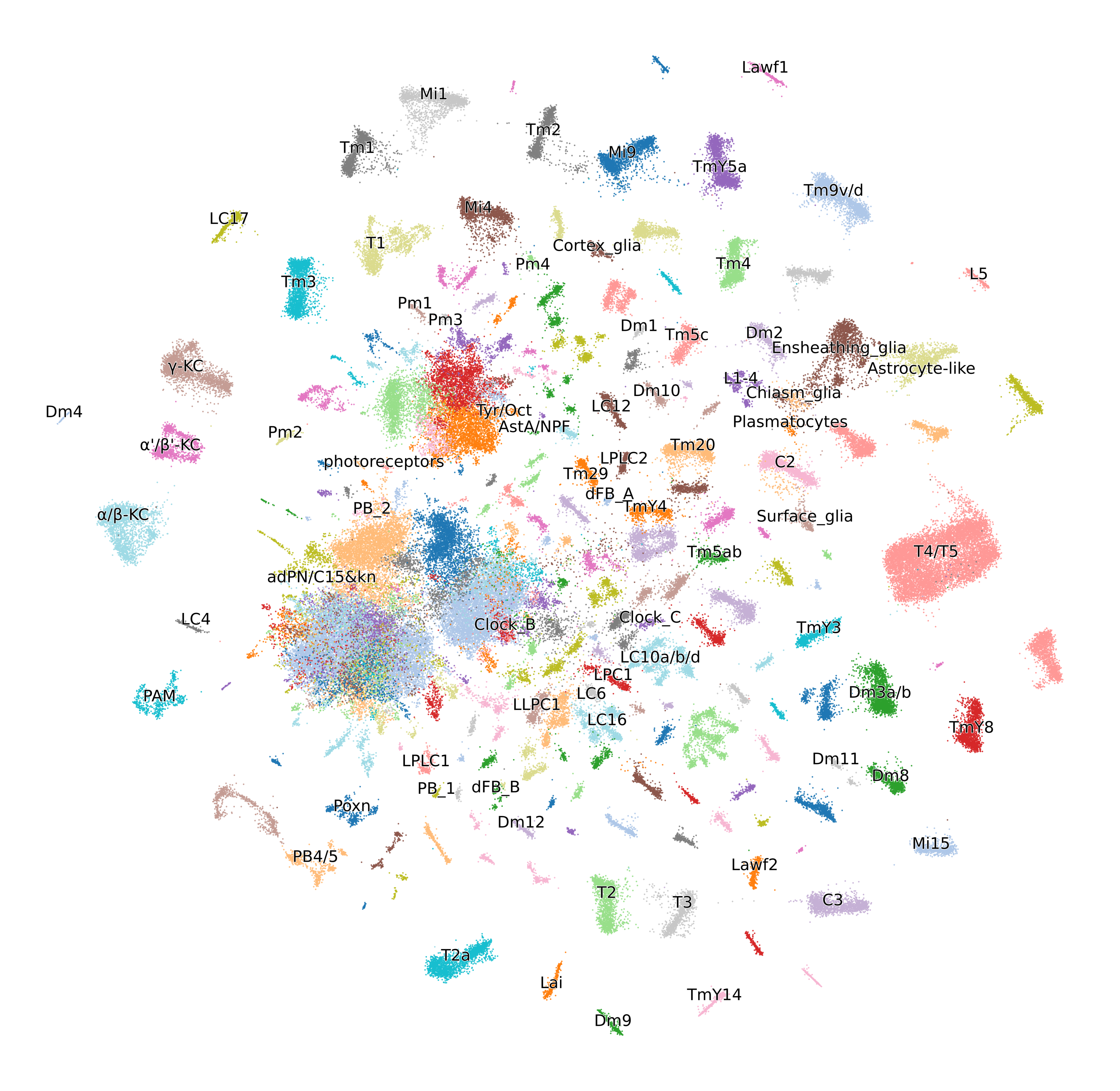 A Figure from Roman's publication that demonstrates cell-type diversity across the entire fly brain. Individual dots represent unique cells and clustered groups the different cell-types.
